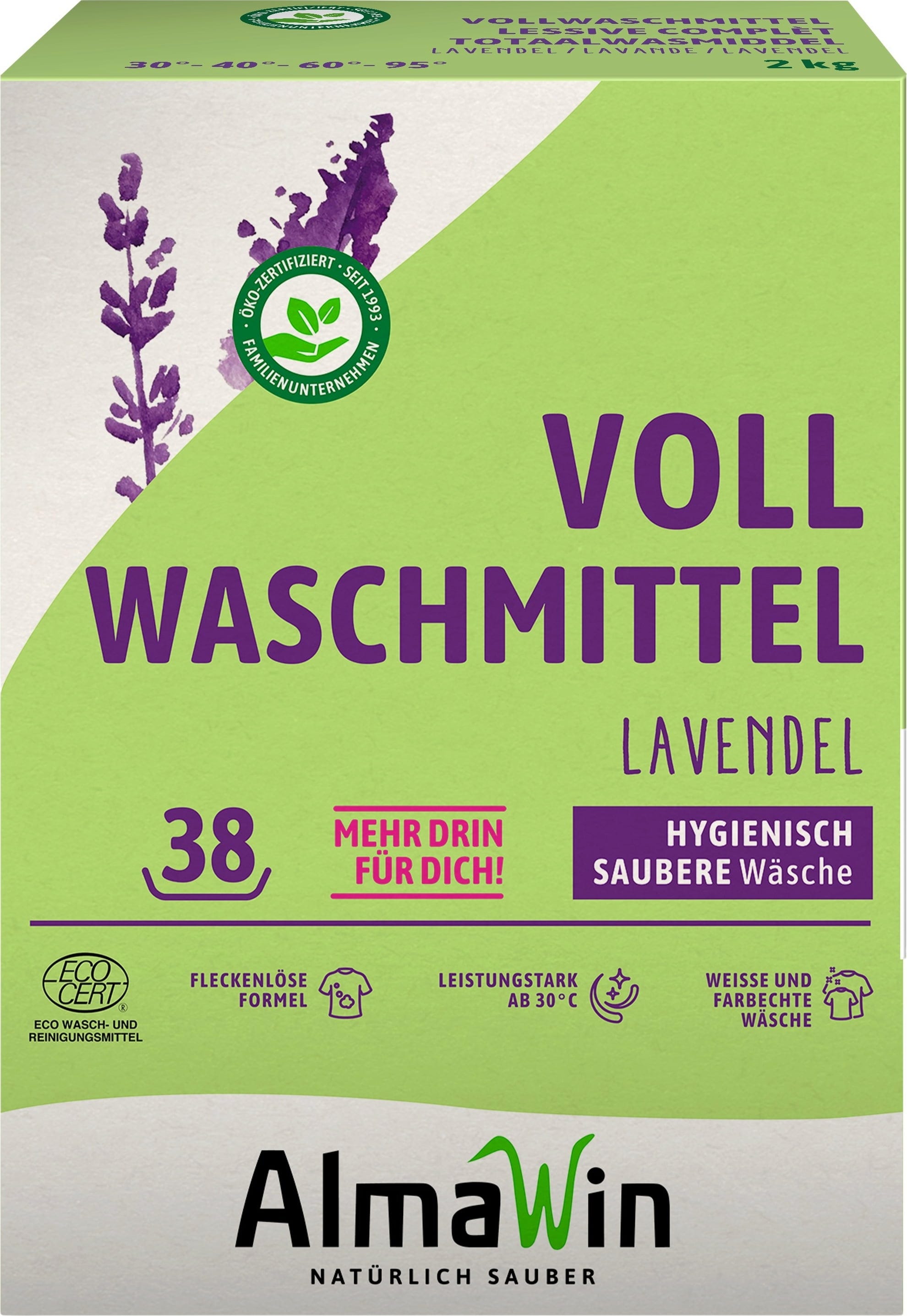 Az AlmaWin bőrgyógyászatilag tesztelt univerzális mosószere pamutból és pamutkeverékekből készült fehér és színtartó színes ruhákhoz, illetve 30 °C és 95 °C közötti hőmérséklethez ideális. A benne található aktív oxigénnek köszönhetően nagy mosóerő jellemzi, valamint megbízhatóan eltávolítja a szennyeződéseket és foltokat a textíliákról. Ugyanakkor a fehér ruhákat is védi a beszürküléstől. Emellett a GMO-mentes enzimek és a rizskeményítő megkönnyítik a vasalást.