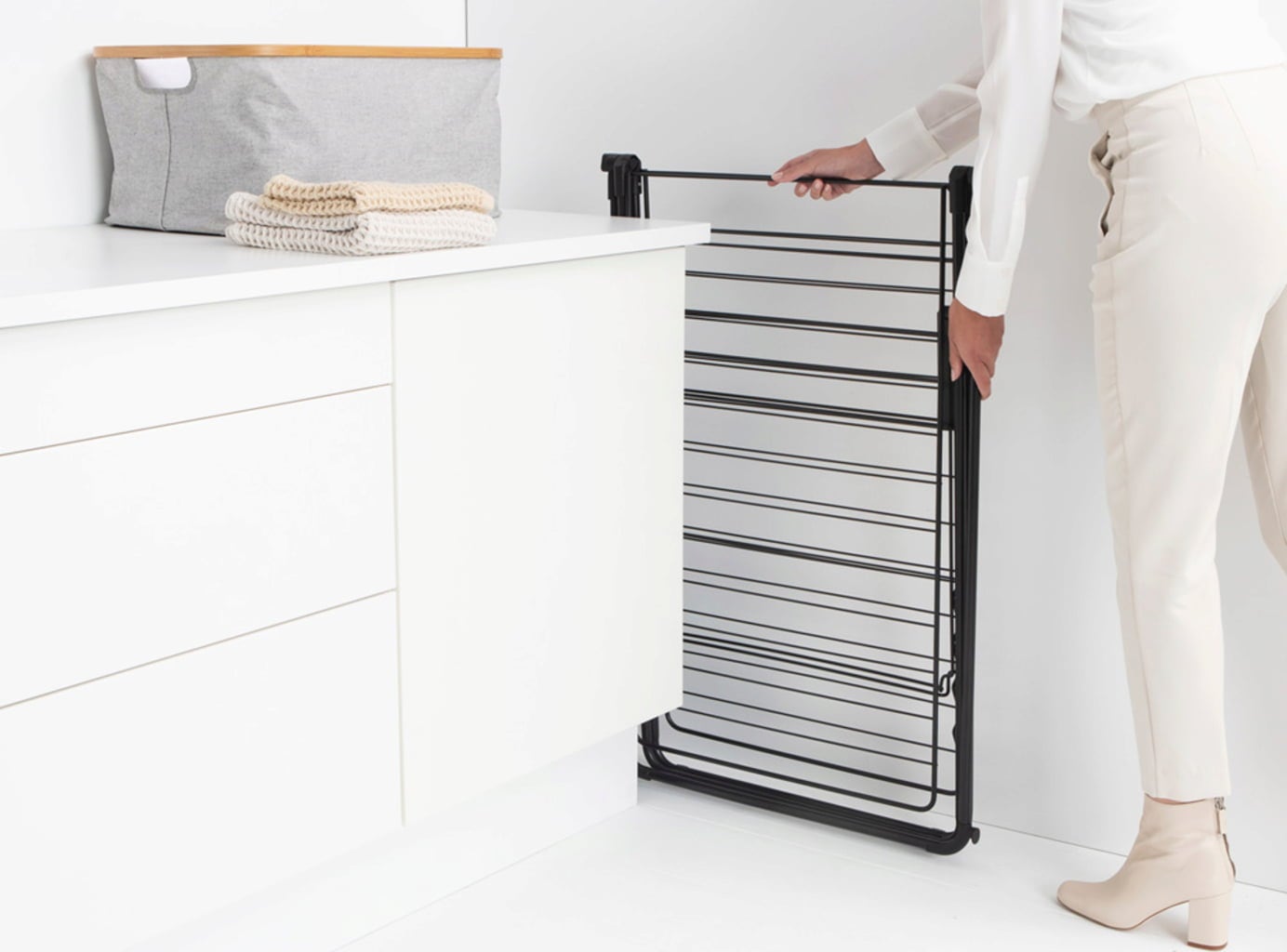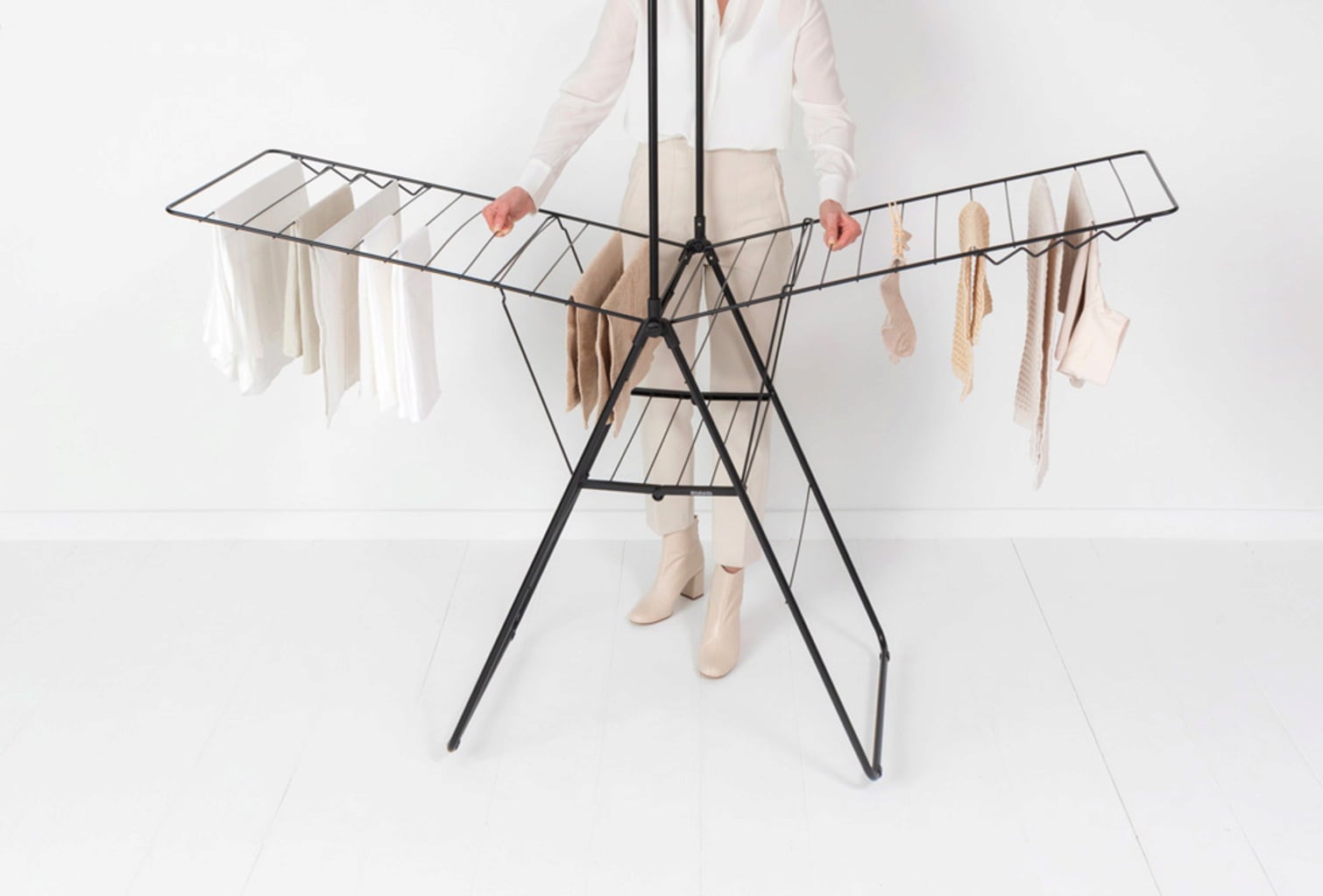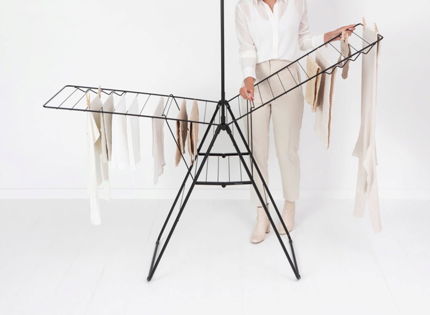 Intelligens funkcionalitás: Akár 18 blúz és ing is szárítható a mozgatható ruhaakasztó rúdon és az oldalsó szárnyakon lévő 8 kampóra akasztva.