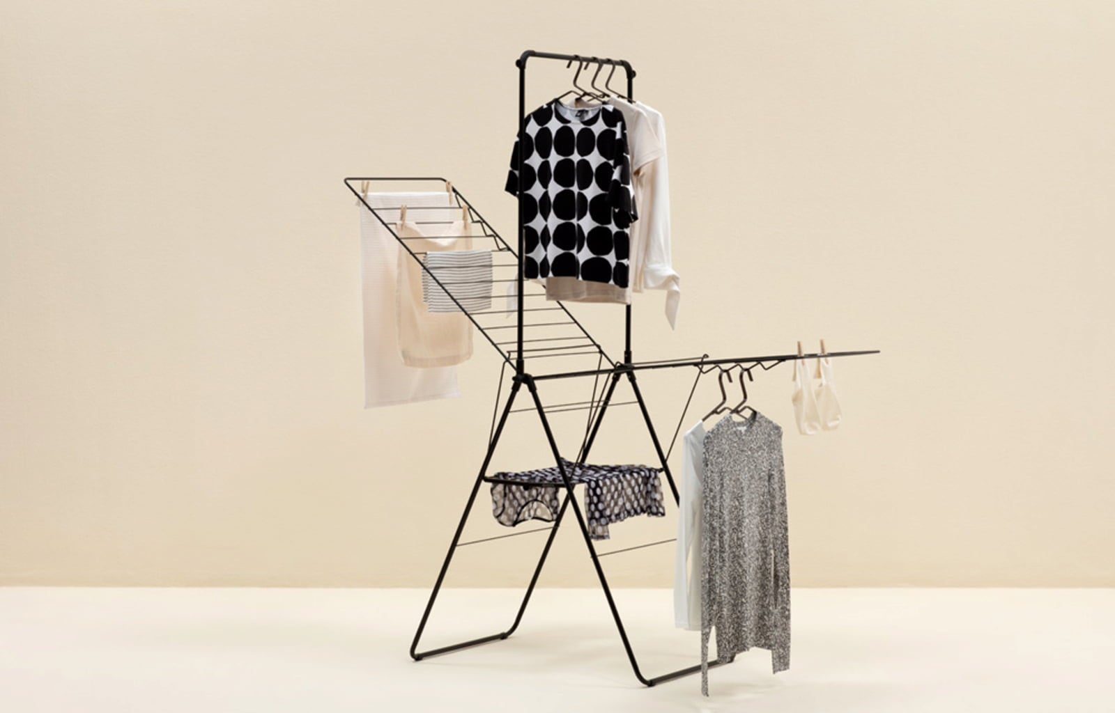 Kezdődjön a ruhák szárítása! Ez a kiváló minőségű, tartós acélból készült ruhaszárító állvány nemcsak tágas méretével nyűgöz le, hanem mindenekelőtt okos kialakításával, amely számos praktikus és funkcionális részletet tartalmaz. Akár 25 méternyi helyet kínál kis és nagy ruhák számára, az állítható szárnyaknak köszönhetően kivételesen rugalmas, és könnyen összecsukható a helytakarékos tárolás érdekében.