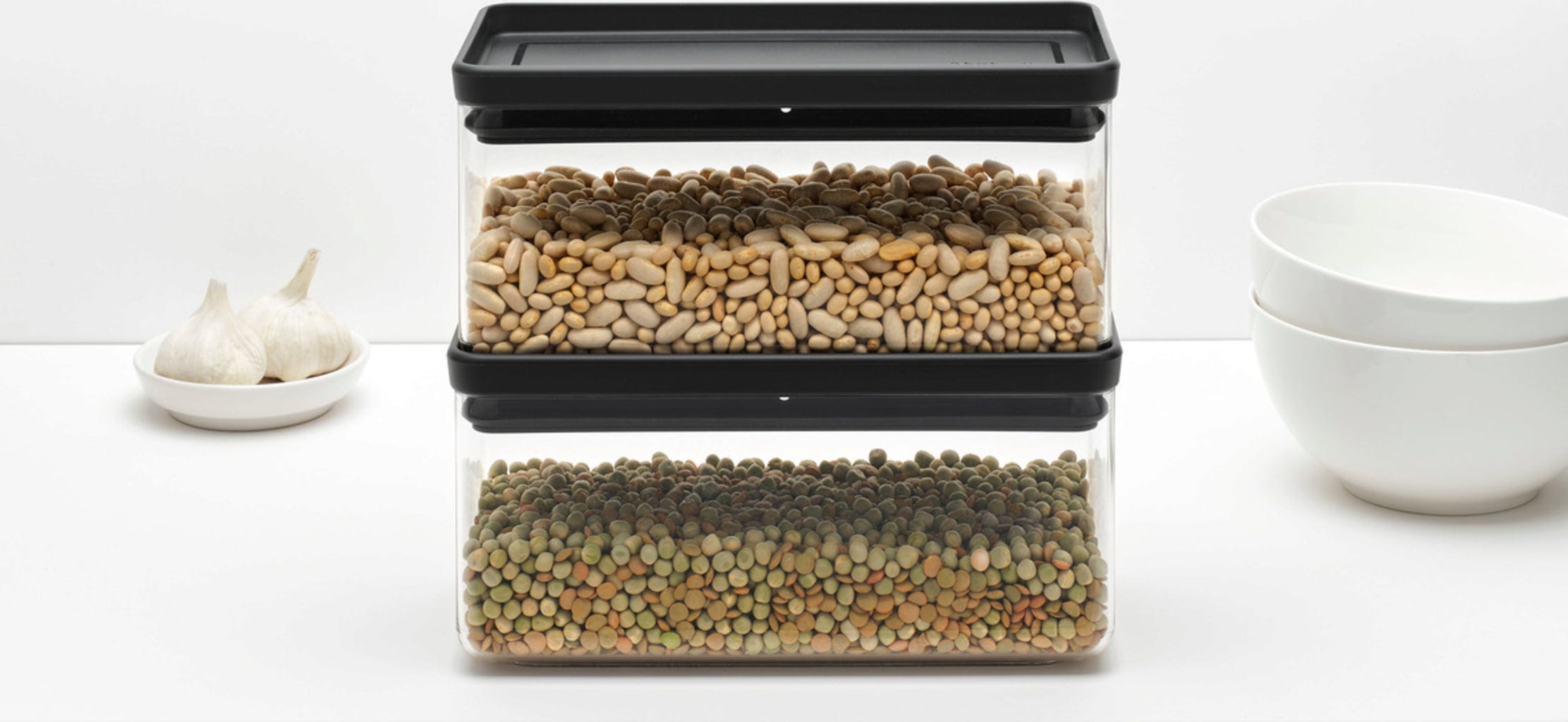 A Brabantia Tasty+ termékcsaládjának átlátszó műanyag tárolói rendet tartanak a konyhaszekrényben. A különböző méretű, helytakarékosan egymásra helyezhető dobozok megbízhatóan frissen tartják az élelmiszereket, és a tartalmuk egy pillantásra látható.