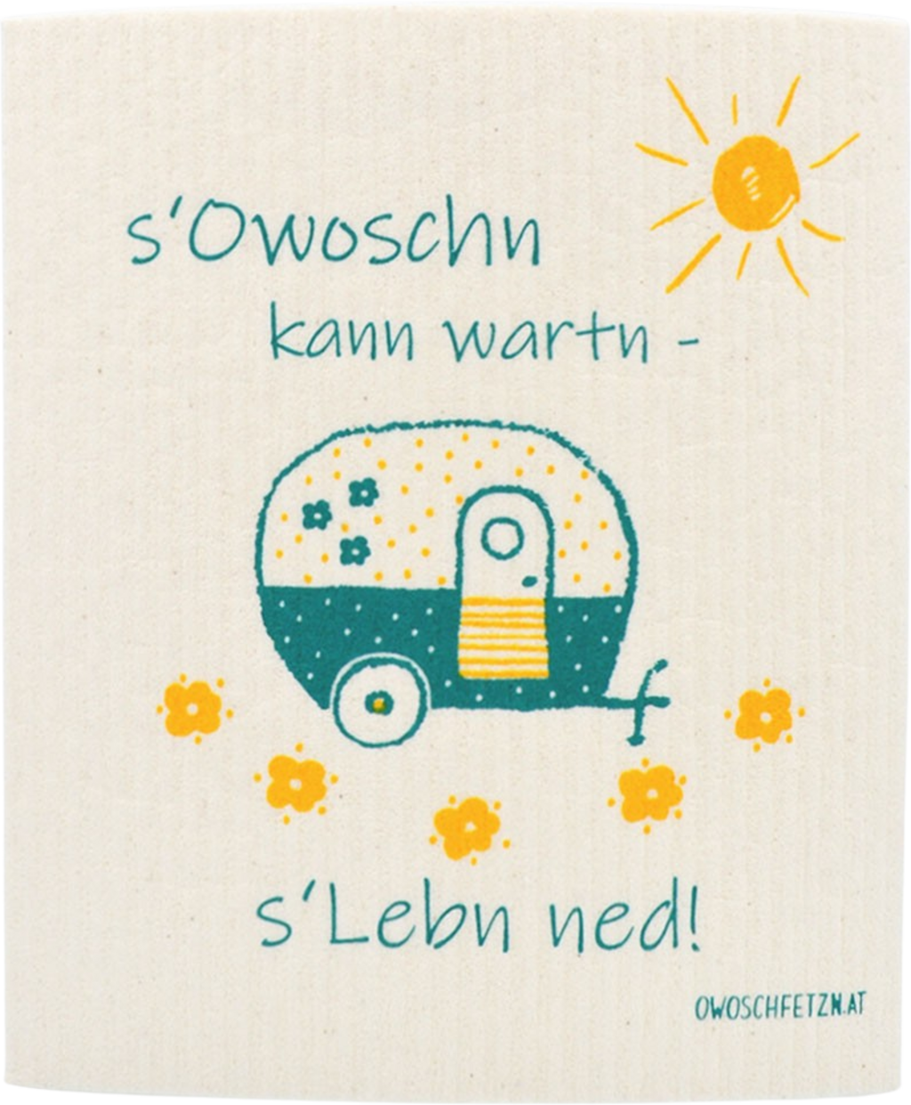 OWOSCHFETZN Camper "s'Owoschn várhat - s'Lebn ned!" szivacskendő, petrol/sárga
